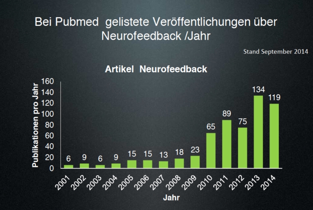 In den vergangenen Jahrzehnten hat sich das Neurofeedback aufgrund der immer besser werdenden technischen Möglichkeiten rasant weiterentwickelt und ist in den USA sehr verbreitet. In Europa nehmen die Schweiz und Deutschland eine Vorreiterrolle ein. Es sind viele weitere wichtige Erkenntnisse und Studien zur Wirksamkeit von Neurofeedback hinzugekommen, zusätzliche Krankheitsbilder erforsch, Mess- und Therapiemöglichkeiten etabliert worden. Der Anstieg der veröffentlichenden Studien und publizierten Beiträge veranschaulicht diese Entwicklung (Stand 2009!):